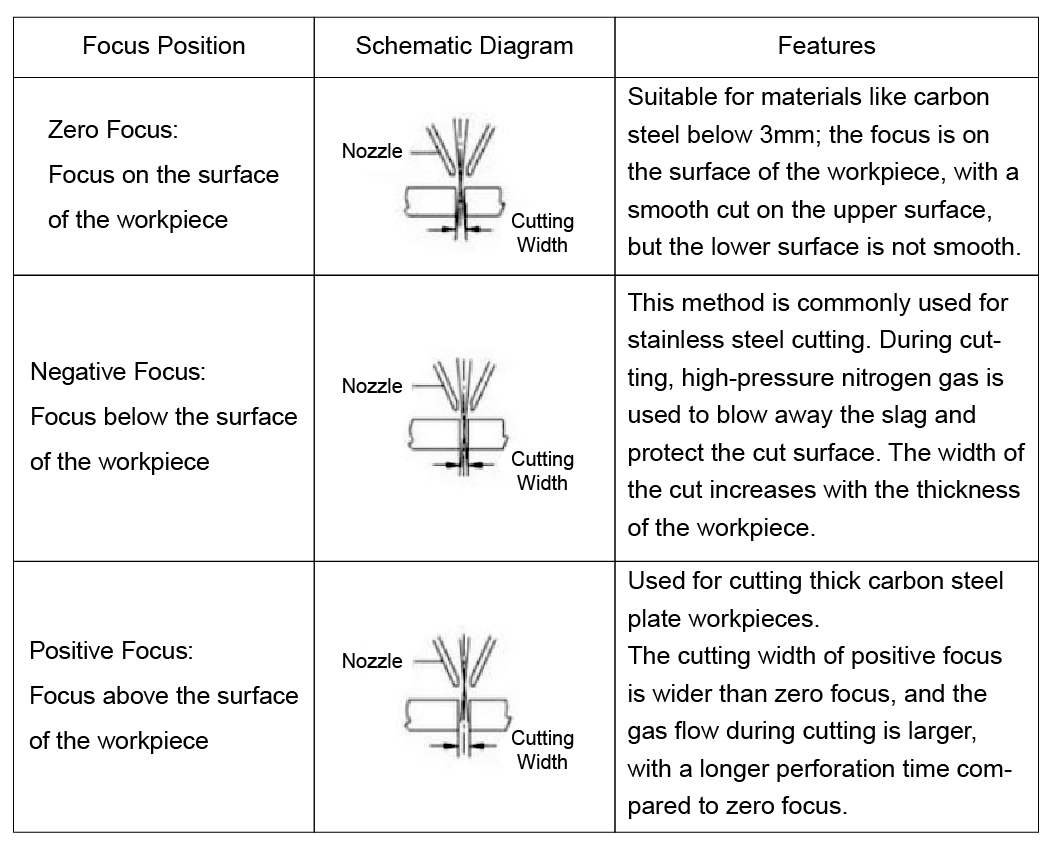 Coupe de plaques moyennes et épaisses:Pour les plaques moyennes d'épaisseur, pour assurer une bonne qualité de bord, une concentration négative est généralement adoptée. L'accent est mis plus profondément dans le matériau pour élargir la coupe et améliorer le flux de gaz et de matériau fondu, garantissant qu'une densité d'énergie suffisante est appliquée à la zone de coupe.